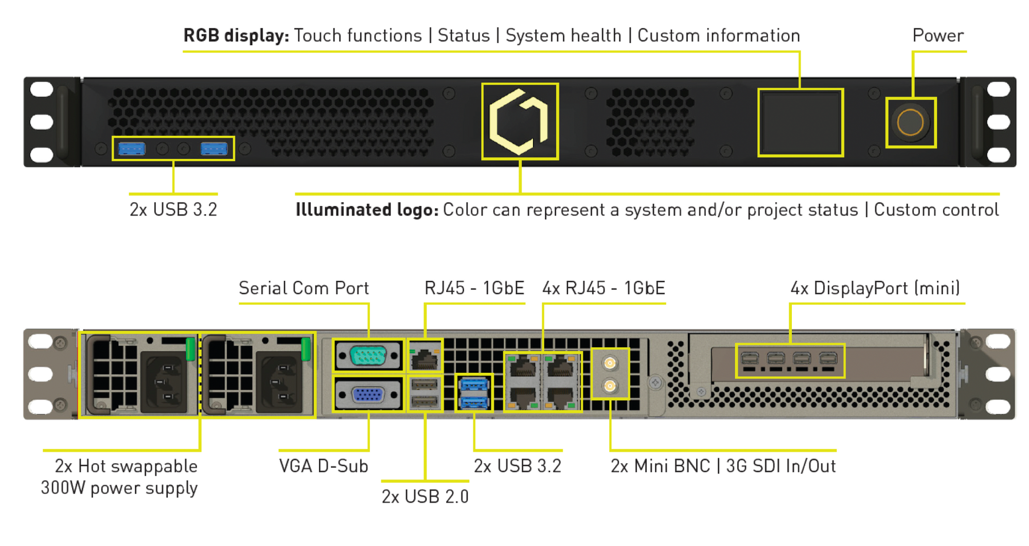 An RGB touch display and illuminated status logo provide instant visibility of system health.